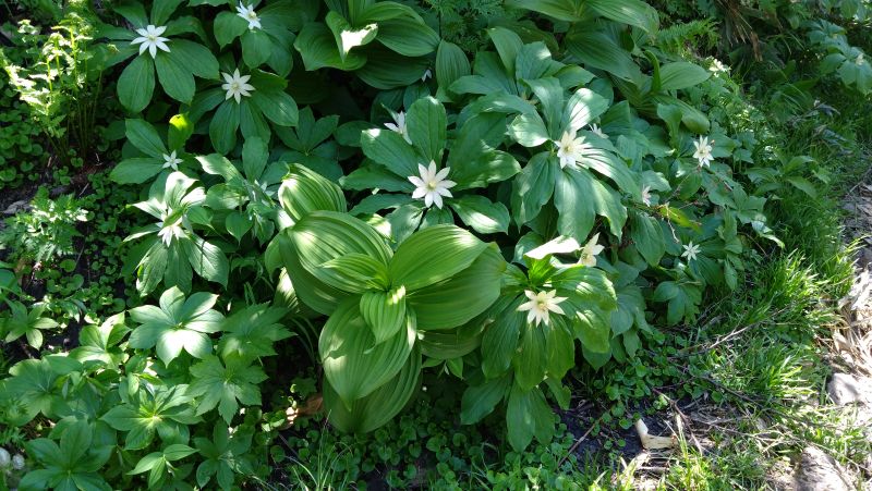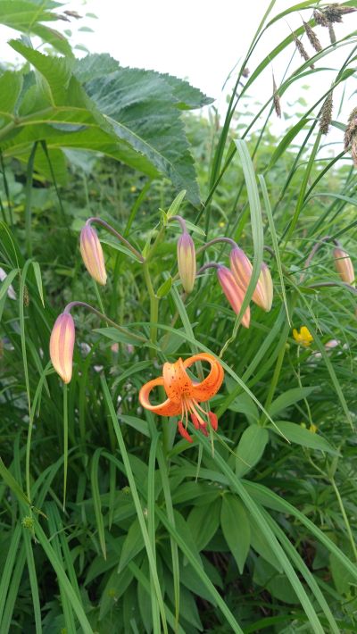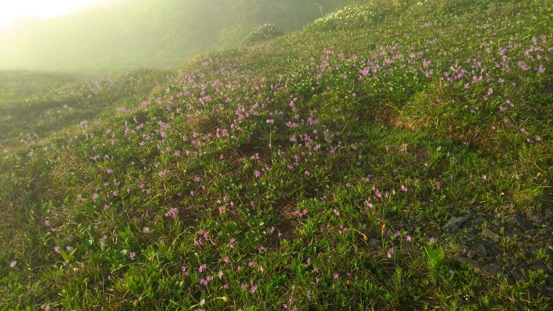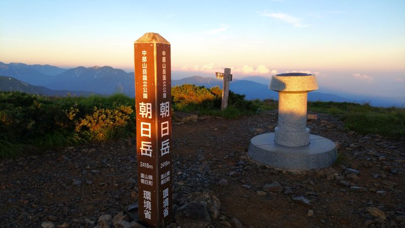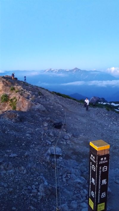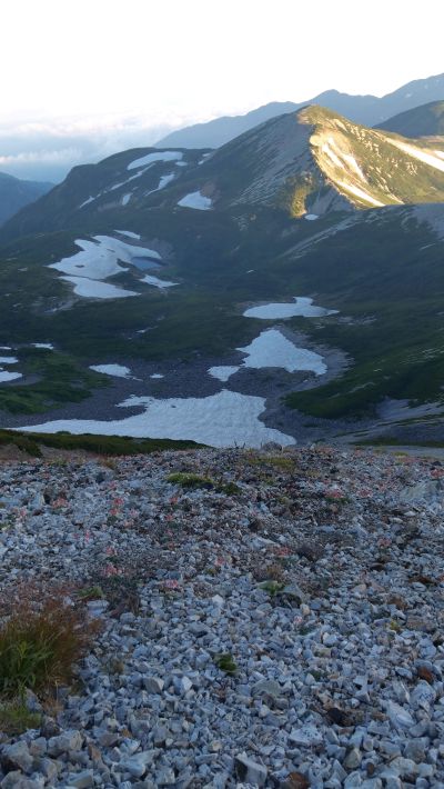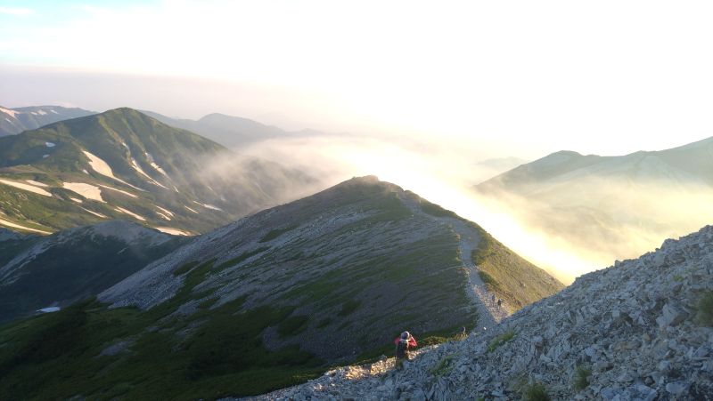 | 3日目3時半に小屋を出る。40分も歩くとだいぶ明るくなってきてヘッデンを消した。当初の予定を少し早めての出発だったが朝日岳山頂で朝日(ここでは朝日)が拝めたのだ。朝日小屋のご主人に感謝!山頂下には残雪があったがアイゼンは着けずに慎重に下る。栂海新道の分岐で朝食をとる。朝日小屋は朝食がないが御握りとパンの販売がある。ますの鮓400円を買ってみたが美味しかった。今日も晴天、展望もよく昨日横を通過した赤男山、朝日、雪倉、小蓮華、新潟側は苗場までよく見えた。しかし展望と花を楽しみ過ぎて遅れてしまう、少し早く出ただけなのに余裕のつもりでゆっくりしてしまった。メンバーに誤り早足をお願いする。五輪高原1700m辺りから谷を挟んで目的地の蓮華温泉の建物が同じ位の標高で小さく見える。(実際は1450m)登り返しがきつそう・・見えない方が良かった。景色のいい木道を沢山の人が登って来る。今日は金曜明日からも天気は良さそうだ。白高地沢で予定の時間を取り戻し温泉に1時間入る事ができたFTさんとMNさんは余裕でスイカを食べていた。バスで糸魚川に行きそうめんを食べて帰路につく。 今回は天気の心配が全くなかった。花の時期が合い沢山の花園を見れた。3日とも晴れで暑さにやられたので対策する必要を感じた。山行中、先の道の形状を確認したり時間を調べて下さったり、常に地図を広げてくれた頼もしいサブリーダーFTさん、暑さ慣れしていないせいで食欲が落ちたにも係わらず3日間普通に歩き通してくれたMNさん、とても楽しい素晴らしい山行でした。集中連絡を引き受けて下さいましたHDさん 皆様ありがとうございました。 KD |