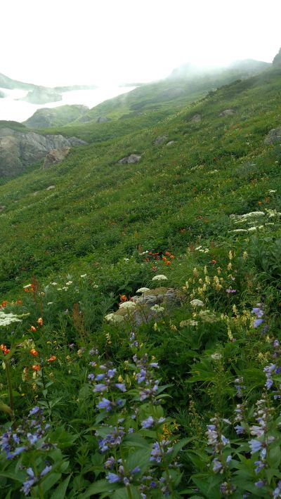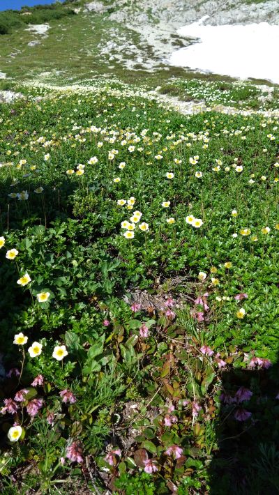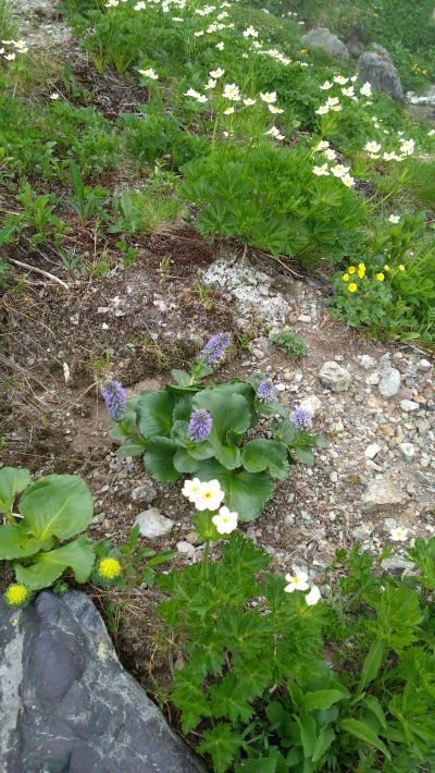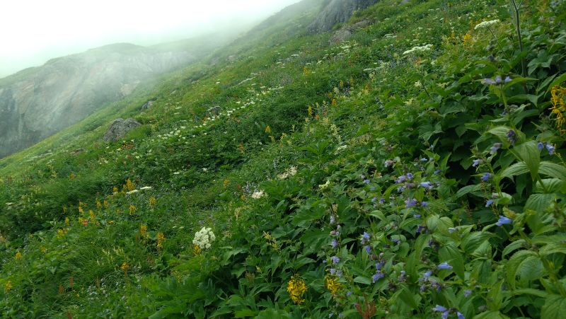 | 感想 2018年夏にFTさんが同ルートで計画された。しかし、残念なことに天候不良の為流れてしまった。 昨年FTさんの了解を得、再提出するがやはり雨のせいで行けなかった。しかし、念願叶って今年決行できた。 天気は心配していた雷警報も消え晴れ予報。夜行バスは4列シートだったがシートは倒せてゆったりしていた。登山口には大勢の若い人がいて北アルプスの人気をしかと拝見する。青空の中歩き始めたのだが白馬大雪渓の中ほどからガスで視界が悪くなり落石に注意しながら登る。雪渓の上なのにとにかく暑い。昨年は雪が少なくてクラックが入り通行止めだったが今年は雪が多いという。初めて来たので比べられないが雪はたっぷりあった。ないより嬉しい。雪渓が終わると花がでてきた。雪どけが遅かったせいかいろいろな種類の花が沢山咲いていた。頂上宿舎から標高で100M位下に大岩があり時間に少し余裕があったのでその上で20分程花畑の景色を眺めた。百花繚乱とはこの事だろう・・斜面一面にずっと花がさいている。こんなに素晴らしい場所を今まで知らなかった。今いるのにまた来たいと思った。山荘までの間もウップ草やコマクサ、イブキジャコウ草、ウメバチ草、シオガマ等、フラワーロードで疲れをドーパミン?がおさえこんでくれた。山荘は大部屋で3グループが使用していた。我々が外でビールを飲みゆっくりして部屋に入ると1グループは布団で横になっている。夕飯はさすがに大所帯の小屋だけに手際の良い流れ作業ですすむ。次の日は4時発だ。 |