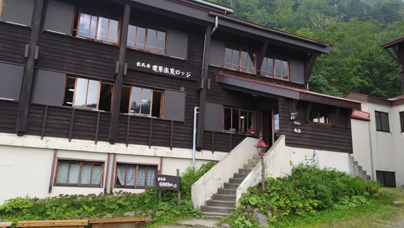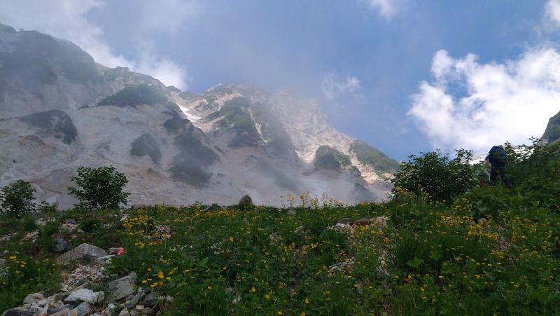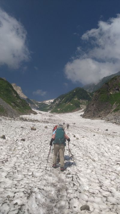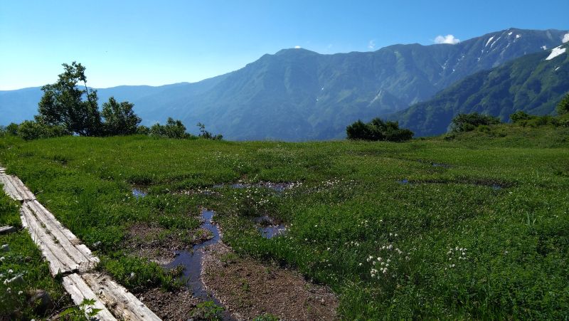 雪倉岳の山頂で雲で見え隠れする白馬、蓮華を眺めつつお昼を食べ朝日小屋に向かう。万年雪なのか今日は数回残雪をトラバースする。赤男山の斜面に30mほどの大岩がどーんと現れる。ツバメ岩と標記がある。ここの水場は枯れていた ソロの男性がこの先朝日岳へ直接登るルートは雪が残っていて道もどろどろだから止めた方がいいと助言してくれた。幸い我々は水平道ルートであったのでお礼を言い別れる。しかし、水平道は長く感じた。花がないのだ!唯一、小桜が原は湿原でなんと水芭蕉が咲いていた。朝日小屋が見えているのになかなか着かない。時間が13時から15時のこの時間が特に暑かった。小屋手前の沢で少し涼をとり15時に小屋に着く。(超早立ちグループなら13時に小屋に着けたのか・・・などと思う。)朝日小屋の女主人はハッキリものを言う人で有名らしい。今日の歩行時間を計算されて、「11時間かかってる。明日は3時半に出て下さい。」と計画変更を強制された。部屋は個室をもらえた、夕飯はホタルイカや麺御代わり自由の胃に優しいご飯だった。 |