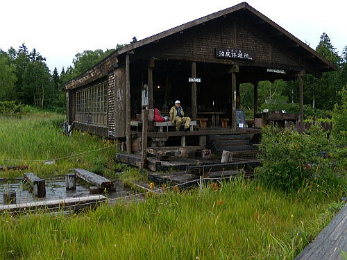 | 沼尻休憩所。残念ながら、9月21日火災で焼失。 | 霧雨の大江湿原、グループ全員で。 |