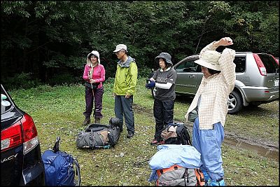| キャンプ場を7時前に出発し、24時間営業スーパーで今夜の食材を調達し、古寺鉱泉登山口から登山を開始する。「朝陽館」前を通り過ぎ整備された道を進む。ひたすら高度を上げ、途中、三沢清水の美味しい水で喉を潤す。古寺山に到着する頃には、周りの木々はほんのりと赤や黄色に染まり始めていた。間もなく樹林を抜けだし、目の前に小朝日岳が現れる。小朝日岳の手前の巻き道を通り、山頂には明日登ることにする。パラパラと小雨が降り出し、視界が数十メートルしかきかない。4時過ぎに大朝日小屋が突然現れてホッとする。小屋の中は50人程度の登山客で混雑していたが、あてがわれた3階は、我々5人だけで横になれる一角で、皆さんご満悦。早速、西朝日岳方面に10分ほどの金玉水へ水を汲みに行く。その後「豚鍋」で宴が始まる。管理人や都内からのアラフォー3人組との会話も弾んでいたが、消灯時間(8時)が迫り、お開きに。明日は4時に起床して5時には山頂に向かう予定だが、星空が見えており好天が期待できそうだ。 |