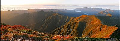 | 早朝5時に小屋から大朝日岳の山頂を目指すが、15分程度で到着する。夜明け間近の薄明りの中、寒さを感じながら御来光を待つ緊張感が好きである。 15分ほど経つと東の空が白み始めた。水墨画のような雲海が周り一面に浮かび、あちこちでシャッターがきられている。1時間ほど朝焼けを堪能し、小屋へ戻り朝食を摂る。帰り際に、小屋の前で管理人の阿部さんと写真を撮って別れを告げ、8時前に出発する。昨日は全く見えなかった、標高1,800m辺りからの絶景を眺めながら、ゆっくり下山する。月山、飯豊、吾妻といった東北の山々が一望できる。また北東側には、西朝日岳や竜門山が大きくそびえ、そこに繋がる雄大な稜線を見ていると、また来たいと思ってしまう。紅葉もしっかり俯瞰できる。 目の前の小朝日岳がどんどん大きくなる。小朝日岳山頂に着き、ここからの行程を相談する。昨日とは異なる行程で、景観も楽しめそうダとの判断で、鳥原山を経由して帰ることにする。無事に駐車場に戻り、途中の柳川温泉で汗を流し、18時過ぎに山形駅に到着する。その後、駅前の居酒屋で反省会。地元の芋煮や魚介に舌鼓を打ち、23時発の夜行バスで新宿に向かう。 |