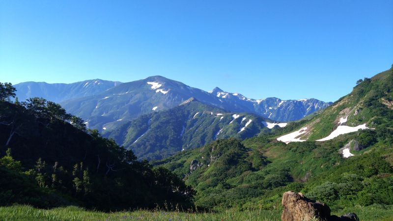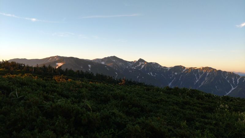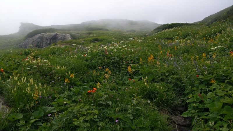 | 3日目3時半に小屋を出る。40分も歩くとだいぶ明るくなってきてヘッデンを消した。当初の予定を少し早めての出発だったが朝日岳山頂で朝日(ここでは朝日)が拝めたのだ。朝日小屋のご主人に感謝!山頂下には残雪があったがアイゼンは着けずに慎重に下る。栂海新道の分岐で朝食をとる。朝日小屋は朝食がないが御握りとパンの販売がある。ますの鮓400円を買ってみたが美味しかった。今日も晴天、展望もよく昨日横を通過した赤男山、朝日、雪倉、小蓮華、新潟側は苗場までよく見えた。しかし展望と花を楽しみ過ぎて遅れてしまう、少し早く出ただけなのに余裕のつもりでゆっくりしてしまった。メンバーに誤り早足をお願いする。五輪高原1700m辺りから谷を挟んで目的地の蓮華温泉の建物が同じ位の標高で小さく見える。(実際は1450m)登り返しがきつそう・・見えない方が良かった。景色のいい木道を沢山の人が登って来る。今日は金曜明日からも天気は良さそうだ。白高地沢で予定の時間を取り戻し温泉に1時間入る事ができたFTさんとMNさんは余裕でスイカを食べていた。バスで糸魚川に行きそうめんを食べて帰路につく。 今回は天気の心配が全くなかった。花の時期が合い沢山の花園を見れた。3日とも晴れで暑さにやられたので対策する必要を感じた。山行中、先の道の形状を確認したり時間を調べて下さったり、常に地図を広げてくれた頼もしいサブリーダーFTさん、暑さ慣れしていないせいで食欲が落ちたにも係わらず3日間普通に歩き通してくれたMNさん、とても楽しい素晴らしい山行でした。集中連絡を引き受けて下さいましたHDさん 皆様ありがとうございました。 KD |