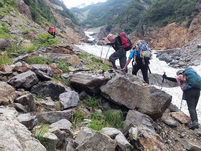 | 《初日》 連日猛暑が続いており、天気の心配はなく山行を迎えました。メンバ-も昨年の岩手山・早池峰山の方々で気心も知れています。長野駅でバスへの乗り換えが15分しかないので、新幹線でトイレは済ませバス乗り場へ即向かいました。それでも乗り場は長蛇の列で、どうにか座席確保できて時間通りの出発になりました。扇沢は入会間もない頃、鹿島槍から五竜岳山行で来たことがあり懐かしいところでした。登山口はバスゲ-トの左側にあって登山ポストもあります。熊鈴鳴らして出発しました。歩きやすい登山道から一部舗装道に出ますが、その後本格化な登山道に入ります。木々の中の分かりづらいルートや、梯子、石がゴロゴロ、ガレ場もありましたが大沢小屋へ到着、ここで昼食にしました。しばらく進むと雪渓の入り口ですが、事前に確認したところ、雪渓は通行止めで脇にある「高巻ルート」と言う夏用道を使って登って来てくださいとのことでした。丸太の橋を渡り雪渓を横目に通過して高巻ルートに取り付きます。普段使われていない道なので踏み跡が分かりづらく時間がかかりました。小屋手前のつづら折りの階段はかなりの傾斜のガレ場、ここを下るのは危険と感じるくらいでした。小屋に着くと夕食の準備ができていました。 《二日目》 5時半の朝食に間に合わせようと、3時に出発して蓮華岳を目指しました。小屋からは一本道ですが、40分くらい進んだところが広くなっていて暗闇で方向を見失ってしまいました。GPSで確認しましたが、頂上に行けても朝食に間に合わなくなるので残念でしたが引き返すことにしました。食事を頼まなければ時間に縛られなかったと反省しました。朝食後気持ちを切り替えて針ノ木岳に出発しました。予定通りの時間に到着出来ましたが、ガスガスで眺望が見られません。写真を撮って出発すると見る見るうちにガスが晴れて、眼下に黒部湖が見えみんなで声をあげました。エメラルドグリーンで形もはっきり見えて、周りの山々も360度見えます。景色も良いけれどここからは難所の連続、足元に神経集中が必要です。スバリ岳も赤沢岳も周りの名峰たちに負けない立派な山々で、まさにここがサーキットのハイライトと思いました。緊張が解けて次の鳴沢岳でカメラを置忘れてしまいましたが、後続の方が拾ってくださり事なきを得ました。計画より少し遅れましたが、難所の通過が終わり少し気持ちに余裕ができました。新越小屋のスタッフは親切な対応で、到着後の乾杯も格別になりました。 《三日目》 5時に朝食、5時50分に新越岳を目指して出発しました。小屋からは遠い槍ヶ岳まで見え反対側には立山、剱岳、薬師岳など贅沢な景色でした。この先がクマ出没情報エリアで、昨日と違った緊張感がありました。ヤッホ-、ヤッホ-と声を出して纏まって歩きました。金曜日のせいか反対から人も来ます。小さなピークですが新越岳、岩小屋沢岳をほぼコースタイムで通過をし、種池山荘まで辿り着きました。軽い食事休憩をして下山開始。柏原新道はよく整備されていて、歩きやすい登山道でした。柏原新道入口まで下ったのでゆっくり食事休憩をして、最後扇沢までの30分ロードを歩きました。予定のバスに乗ることができたので、計画通りに長野駅でお風呂、レストランで夕食お土産時間も持つことができて、新幹線で帰路に着きました。 |