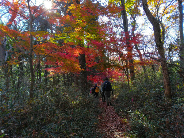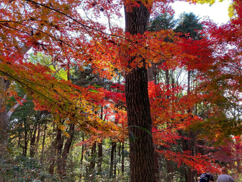 | 空は雲一つない秋晴れ、Sさんに先頭をお願いして歩き出す。ゆっくりペースで歩き約50分で御嶽山(230.9m)に到着。山名板は見当たらないが御嶽神社付近が山頂になるのだろう。神社の一角にある東屋から岩瀬市街の街並みがよく見える。陽に照らされた紅葉(特にもみじ)が一段と鮮やかな中、次の目的地雨引山に向かう。段差は低いが階段続きの道をおしゃべりしながら歩を進めていると今日は「加波山登山競争」の催しのコースとなっており、多くのランナーが次々「すみません。お邪魔します。通ります。」と挨拶をしながら我々の脇を走り抜けていく。我々も「頑張ってください」と応える。階段歩きが終わりほどなく雨引山に着く。山頂は広く筑波山方面の山並を眺めながら長めの休憩をとった後、雨引観音に向かう。ここからは下りとなるが一面落ち葉で滑りやすく慎重に歩く。雨引観音に着くと七五三参りの家族を多く見かける。昼食をとる適当な場所を探していると無料休憩所の案内板を見かけ中に入る。売店の奥の畳敷きの広いスペースで、靴を脱いで上がり、くつろいだ気分になり1時間もそこで過ごす。 計画は上りと同じルートを下る予定だったが周遊コースに切り替える。立派な仁王門をくぐり一般道に出る。集落を過ぎると「つくば霞ヶ浦りんりんロード」が見えてくる。周りの田園風景を見ながら長い 一本道のサイクリングロードを歩き岩瀬駅に戻る。 駅で車組の2人と別れ、予定より1時間早い電車で帰路に着く。 晩秋、好天のもと紅葉の山歩きと麓歩きを楽しんだ一日だった。 |