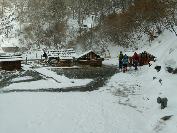 | 【1日目】 天気は何とか持ちそうである。参加者には予め伝えておいたが、今回の宿はネット申し込みで、キャンセルが2週間以内は全額負担となり厳しい。よってよほどの荒天でなければ決行することにしていた。しかしネット申し込みは料金が安く、早目に宿をキープできる点は良いが、キャンセル条件を考慮すると一長一短である。 柏駅で全員揃い、東武線を乗り継いで東武日光駅に行き、そこからバスで本日の登山口である赤沼に着く。ここは戦場ヶ原の入口になっていて、かなり多くのパーティーのスノーシュー客が集まっていた。どうやら戦場ヶ原はスノーシューハイクのメッカになっている様だ。若い方が多く、我々が最年長に思える。 身支度を整え、スノーシューハイクに入る。平坦で気持ち良いコースだ。やや曇天で、時々粉雪が舞うが、あまり気にならない。とにかく雪景色が圧巻であり気分が良い。2時間程スノーシューで歩き、湯滝に着く。ここはちょっとした観光名所で一服入れる。湯滝から湯元温泉に向かうが、途中車道と合流し、暫くの間車道を行く。車道歩きはあまり面白くないので、途中雪の道に入る。しかし、もう湯元温泉は近い。ちょっと大き目なホテルが目の前にあり、名前を見ると本日の宿の亀の井ホテルであった。 ホテルは快適で、素泊まりながら7,100円と安価である。売店もあり、弁当や酒やつまみは手配でき、又、ロビーでゆったりと夕食及び宴会ができた。当然ながら、温泉もゆったりできた。 尚、THさんのスノーシューの全面ボードがはがれるトラブルがあったが、ガムテープで上手く修繕した。さすが建築技師(あまり関連無いか?)と妙に感心した。 |