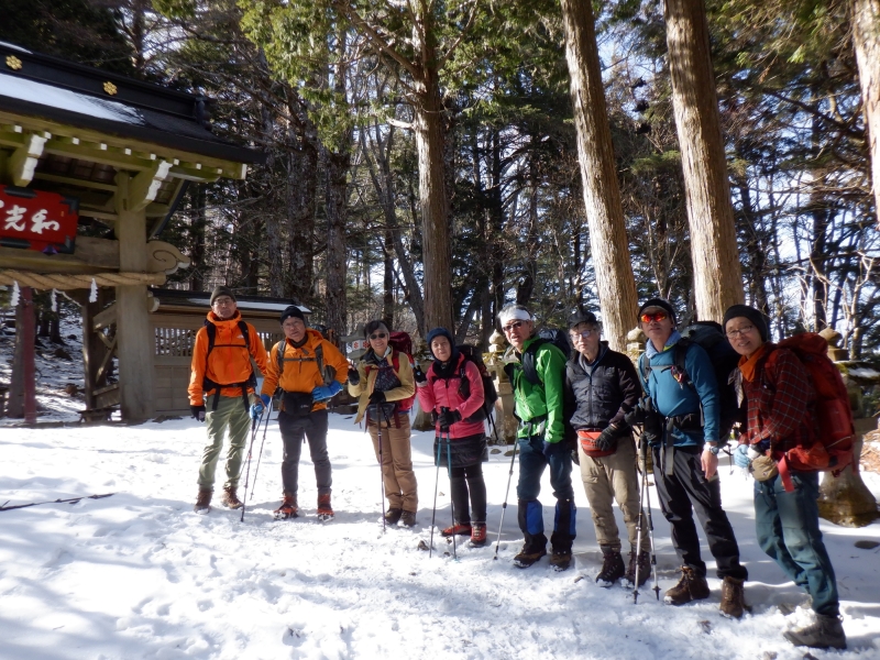 | 2月22日(日) 5時起床、6時から朝勤、6時25分の日の出に合わせて階段を上り随神門をくぐり富士山遥拝所から御来光を望む。6時30分ごろ朝食後、アイゼンを着装して7時30分に宿を出発する。遥拝所の先、狭く登山道らしくなった道を南へ進むと崩壊が進むナナイタガレの縁に出る。富士川流域から見える七面山東面の大ガレだ。ガレの縁に沿って右へ回り込み、コメツガやモミの樹林を抜け出た開けた小平地が三角点のある七面山頂上。頂上は明るいが周囲の木立で展望はあまりよくない。更に南進して往復1時間の喜望峰まで足を延ばす。ここでは南アルプス南部の大パノラマが広がっていた。下りは敬慎院まで往路を戻り、吉祥門で裏参道に入る。しばらく小広い道を下ると二ノ池で、さらに緩やかに下って奥の院。本殿裏手から本格的な山道の裏参道となる。こちらも標高差1200mを越える厳しいジグザグの下りで角瀬地区へ出た。 |