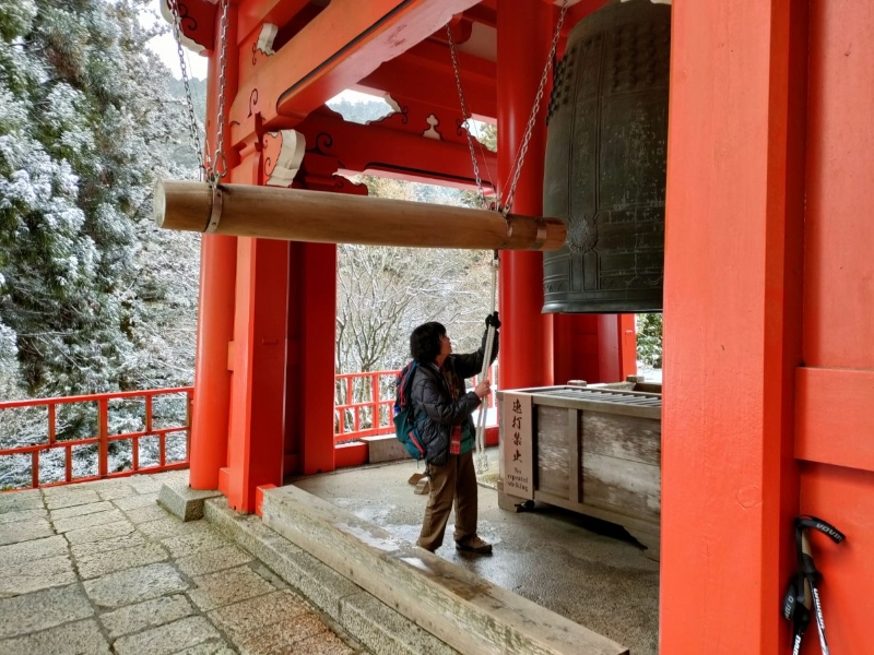 | 3月10日(火) 今日はメインの比叡山に登る。夜のうちに降った雨が北のほうの山には雪になっていた。 昨日の歩数は3万歩近かったため昨日のうちに計画を逆方向にして山頂までケーブルカーで上がり銀閣寺まで下ろうといっていた。雪山の用意をしてないがとりあえずケーブルで山頂へ行き様子を見ることに。滋賀県側の坂本ケーブルに乗ることとして、京都駅から湖西線に乗った。坂本駅から日吉大社に続く参道は素晴らしかった。両側が穴太(あのう)衆の作った穴太積み石垣の続く道路で桜などの木が植えられていて木々の緑と石垣と石畳の調和した見事な道だった。比叡山高校の高校生が元気に上っていく。私たちは彼らに声をかけながら少し遅れ気味についていった。 坂本ケーブルは日本で一番長いケーブルカーだそうで30分に1本「縁」と「福」と名付けられた車両が交互に運行される。上から降りてきた「縁」は雪を窓につけていた。途中信長の比叡山の焼き討ちで亡くなった人たちの供養の石仏が収められている洞窟がある駅等二か所の駅を通過して、比叡山駅に着いた。山頂駅は真白だった。延暦寺方面に雪の積もった滑りやすい道を上る。比叡山の木々は雪を被りとてもきれいだ。時折、風に乗りさらさらと落ちる様子も眩しかった。延暦寺のゲートで料金1000円を払った。根本中堂は2016年から15年をかけた改修工事中で大きな囲みの中の工事用足場のところから改修の様子を見学できた。本堂の大屋根には銅板、回廊には栩葺き(とちぶき)を屋根全面に葺くそうだ(栩葺きとは竹釘で板を打ち付けること)。欄間の彫り物、天井絵、柱の塗り替えなど国宝で世界遺産でもある根本中堂の改修は様々な技術の伝承でもあるとあった。 根本中堂から雪の積もった急な階段を文殊堂へ。雪が積もった朱塗りのお堂が美しい。休憩所にいったん入り昼食をとることにした。外はまた雪が降ってきた。昼食後どうするかを話し合った結果、滑りやすい下りは避けて、来た道を坂本ケーブルで降りることになった。昼食後は東塔を目指し、途中の鐘撞堂で各々鐘を突いた。大講堂や戒壇院、東塔等、延暦寺の中心部を見学し、坂本ケーブルで山を下り、京阪電鉄で京都三条にでた。三条駅から鴨川を渡り先斗町を歩き錦市場へ。錦市場は外国人受けする食べ歩き用のお店が多くなり、前からの店がどんどん消えていきインバウンドの弊害を感じた。前回立ち寄ったイノダコーヒー本店で深煎りの「アラビアの真珠」を愉しみ、京都駅前の居酒屋で乾杯となった。 |