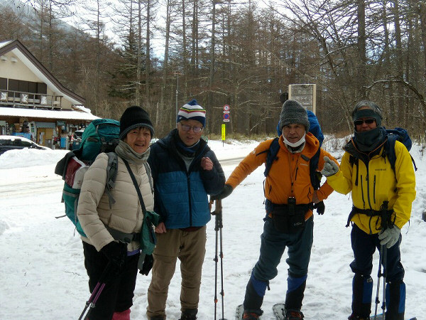 | 【1日目】 天気は何とか持ちそうである。参加者には予め伝えておいたが、今回の宿はネット申し込みで、キャンセルが2週間以内は全額負担となり厳しい。よってよほどの荒天でなければ決行することにしていた。しかしネット申し込みは料金が安く、早目に宿をキープできる点は良いが、キャンセル条件を考慮すると一長一短である。 柏駅で全員揃い、東武線を乗り継いで東武日光駅に行き、そこからバスで本日の登山口である赤沼に着く。ここは戦場ヶ原の入口になっていて、かなり多くのパーティーのスノーシュー客が集まっていた。どうやら戦場ヶ原はスノーシューハイクのメッカになっている様だ。若い方が多く、我々が最年長に思える。 身支度を整え、スノーシューハイクに入る。平坦で気持ち良いコースだ。やや曇天で、時々粉雪が舞うが、あまり気にならない。とにかく雪景色が圧巻であり気分が良い。2時間程スノーシューで歩き、湯滝に着く。ここはちょっとした観光名所で一服入れる。湯滝から湯元温泉に向かうが、途中車道と合流し、暫くの間車道を行く。車道歩きはあまり面白くないので、途中雪の道に入る。しかし、もう湯元温泉は近い。ちょっと大き目なホテルが目の前にあり、名前を見ると本日の宿の亀の井ホテルであった。 ホテルは快適で、素泊まりながら7,100円と安価である。売店もあり、弁当や酒やつまみは手配でき、又、ロビーでゆったりと夕食及び宴会ができた。当然ながら、温泉もゆったりできた。 尚、THさんのスノーシューの全面ボードがはがれるトラブルがあったが、ガムテープで上手く修繕した。さすが建築技師(あまり関連無いか?)と妙に感心した。 |