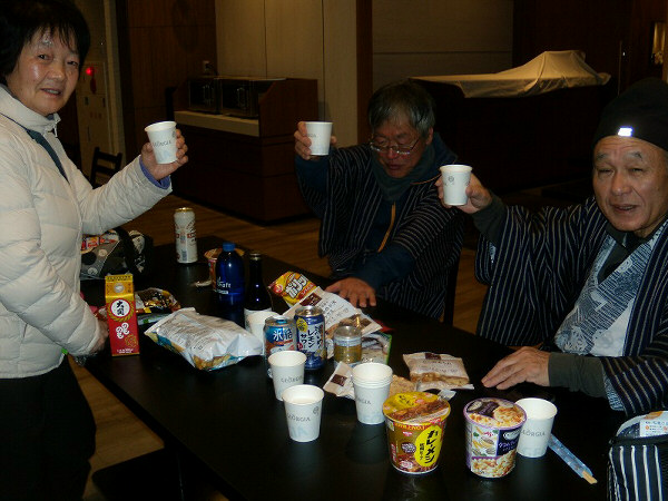 | 【山行を終えて】 途中小雪が舞ったことや突風が吹いたこともあったが、まずまずの天気で雪山のスノーシューハイクを楽しむことができた。 又、宿となったホテルは安価の上快適でサービスも良く、温泉もありゆっくり宴会もできた。切込湖まで行けなかったのは残念ではあったが、雪の一泊スノーシューハイクを堪能できたと思う。 (記 FR) |