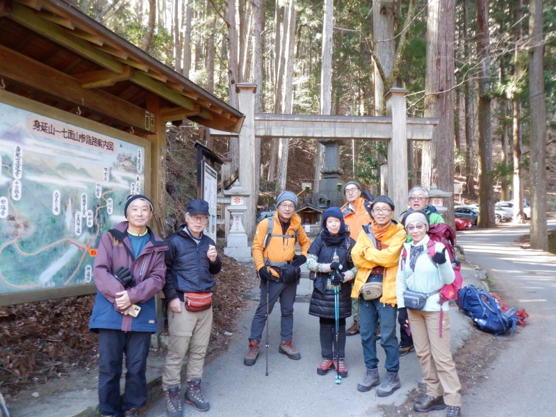 | 2月22日(日) 5時起床、6時から朝勤、6時25分の日の出に合わせて階段を上り随神門をくぐり富士山遥拝所から御来光を望む。6時30分ごろ朝食後、アイゼンを着装して7時30分に宿を出発する。遥拝所の先、狭く登山道らしくなった道を南へ進むと崩壊が進むナナイタガレの縁に出る。富士川流域から見える七面山東面の大ガレだ。ガレの縁に沿って右へ回り込み、コメツガやモミの樹林を抜け出た開けた小平地が三角点のある七面山頂上。頂上は明るいが周囲の木立で展望はあまりよくない。更に南進して往復1時間の喜望峰まで足を延ばす。ここでは南アルプス南部の大パノラマが広がっていた。下りは敬慎院まで往路を戻り、吉祥門で裏参道に入る。しばらく小広い道を下ると二ノ池で、さらに緩やかに下って奥の院。本殿裏手から本格的な山道の裏参道となる。こちらも標高差1200mを越える厳しいジグザグの下りで角瀬地区へ出た。 |